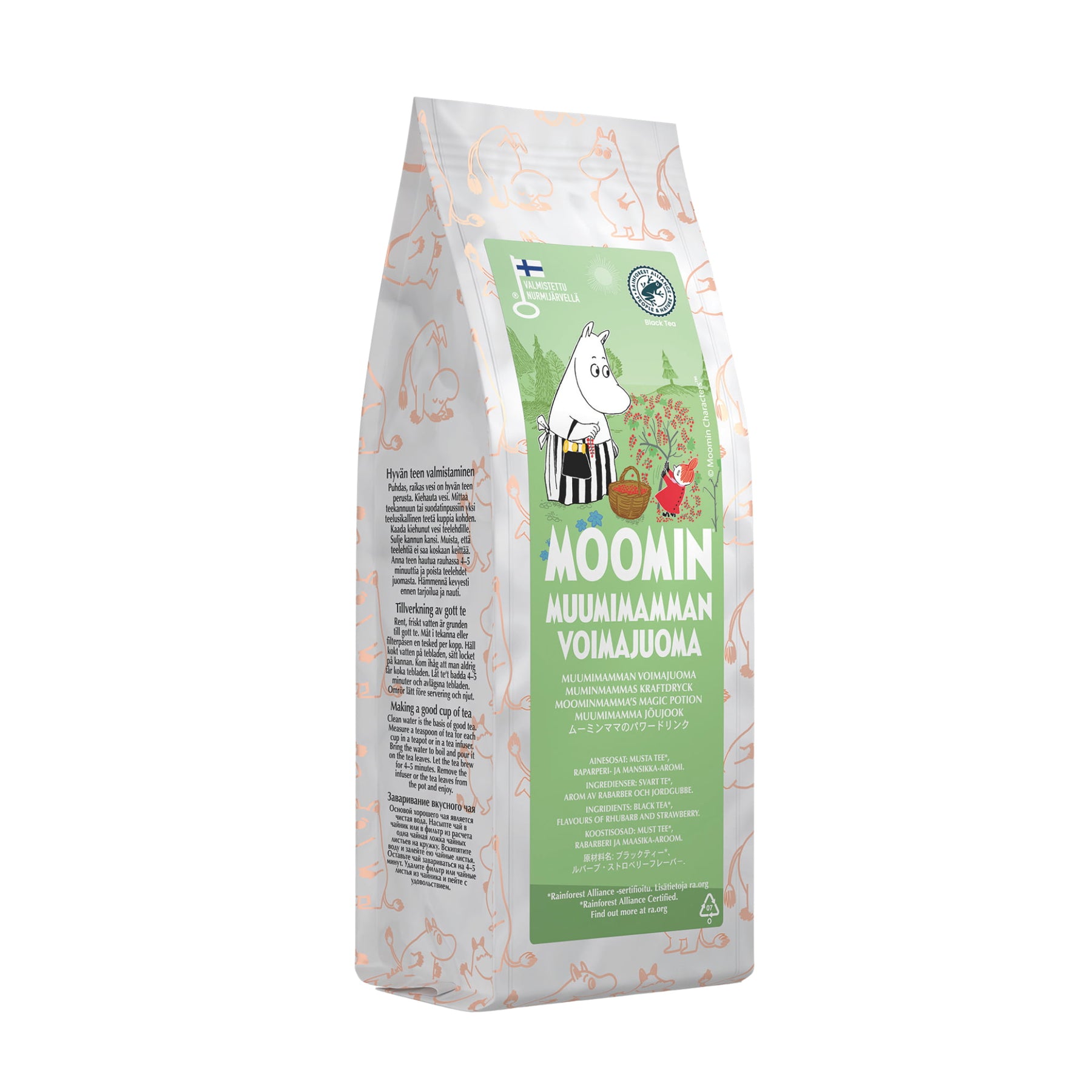 Muumimamman todellinen salainen ase on voimajuoma, jossa musta tee kohtaa kesän kirkkaimmat maut – makean mansikan ja kirpeän raparperin. Tämä ainutlaatuinen yhdistelmä luo lempeän mutta virkistävän juoman, joka tuo iloa niin aamuhetkiin kuin iltapäivän taukoihin.