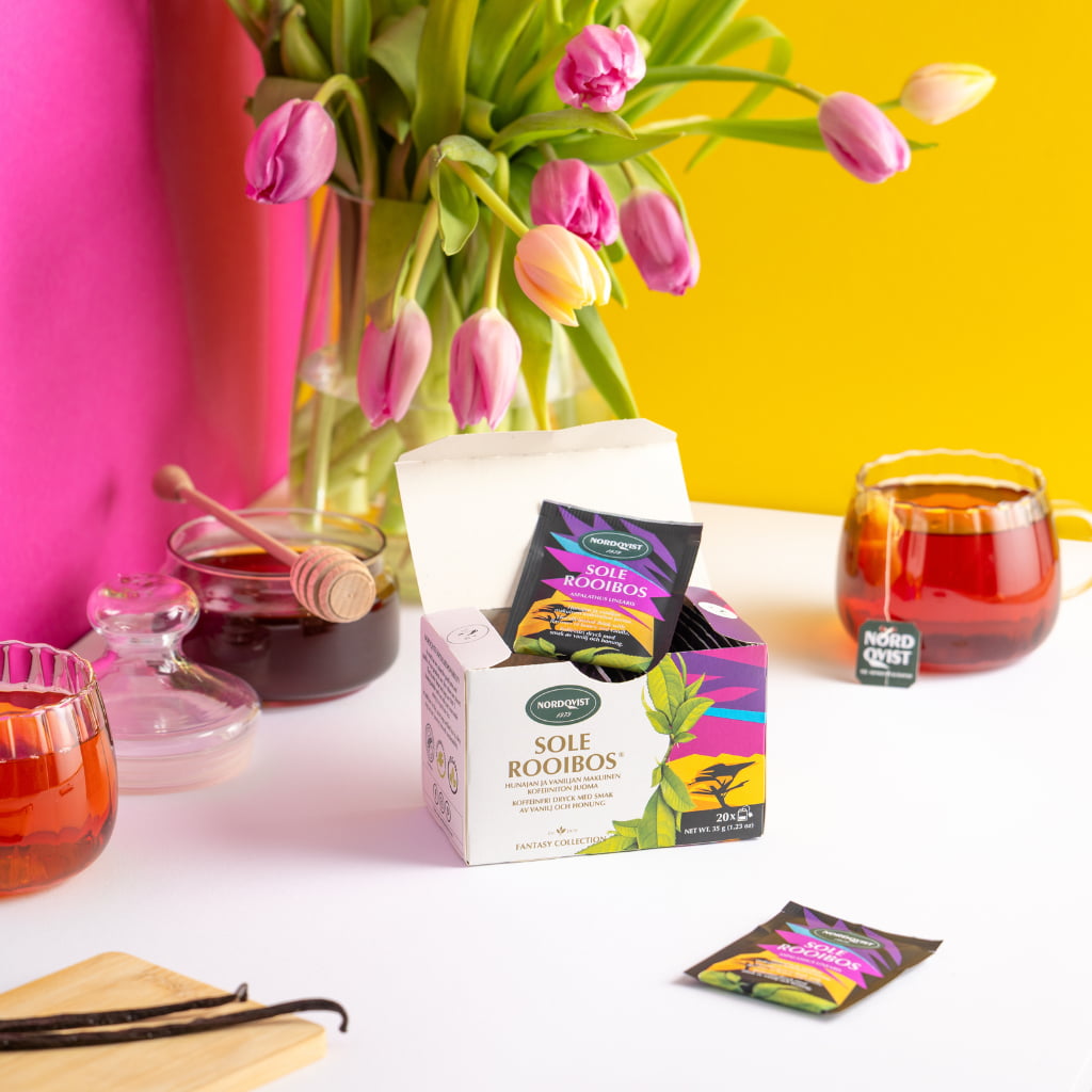 Täydellinen valinta iltateeksi tai hetkeen, jolloin kaipaat kiireettömyyttä ja hyvää oloa. Sole Rooibos hellii aisteja ja kietoo sinut lämpimään syleilyyn – kupillinen kerrallaan.